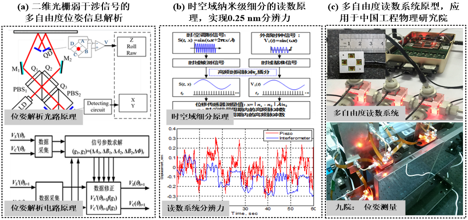 提出了弱干涉信号的位姿解析理论模型,发展了时空域光栅纳米级细分新技术,实现了光栅信号的实时全参量闭环补偿和多自由度读数系统,测量分辨率达到0.25 nm。技术上不仅突破了国外技术封锁、产品禁运的卡脖子局面,自制知识产权的核心技术在国际行业内上形成了互补性。