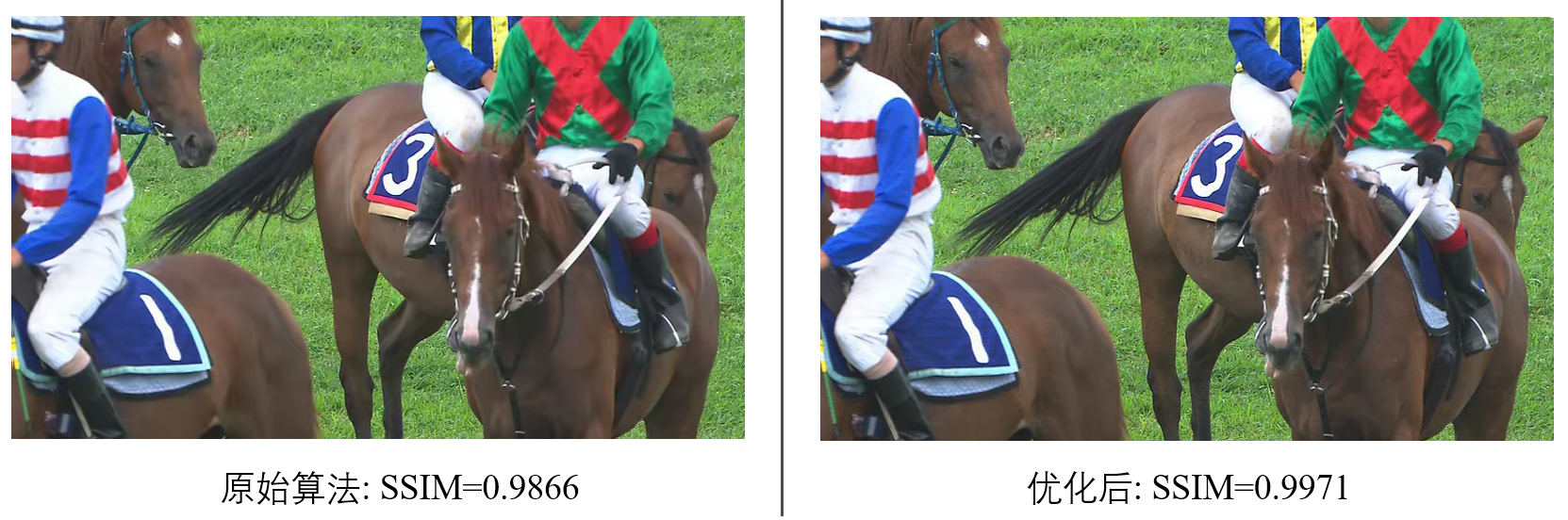 示例视频RaceHorses经原始编码器压缩后结构相似度SSIM值为0.9866,使用优化算法优化后SSIM值为0.9971,其中,两个图像的编码码率完全一致,SSIM质量提升0.0105。人类是否能察觉左右两视频的质量差异?