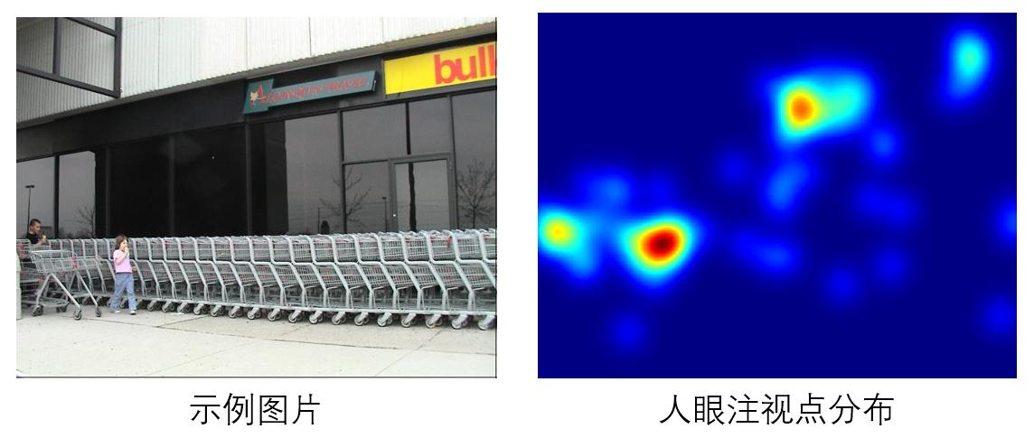 示例图片及其在自由观看任务下的人眼注视点分布。可见观测者在自由观看时注视点主要集中在粉色上衣的孩子。但在文字搜索任务下,或者在图像质量评价任务下,观测者的注视点将如何分布?