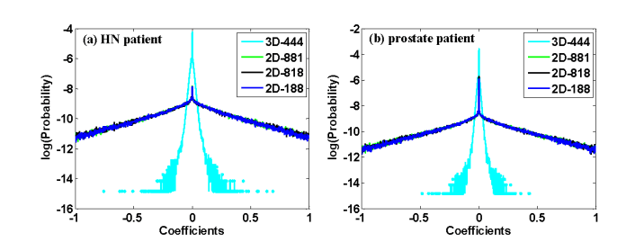 相同原子维度(64),2D/3D字典表示效率的自然图像统计分析结果。(a)和(b)分别表示来自两个重建病人的表示系数的统计分布图,可以明显地看出,3D字典比2D字典在表示人体图像时具有更好的稀疏度,因而具有更好的表示效率。我们进一步的CT重建结果也表明,用3D字典约束可以获得更好的重建图像质量。