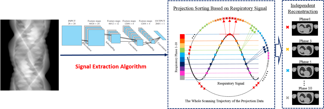 动态锥束CT技术的核心思想是将CT采集到的投影数据根据呼吸信号进行相位分配并分相位重建,达到消除运动伪影的目的。其中呼吸信号提取的准确性将很大程度上影响最终重建图像的质量。研究发现,针对人体胸腔的动态锥束CT技术中的投影数据,富含了表征胸腔在CT照射过程中难以避免的呼吸运动特征。因此,本课题的研究目标将传统数字图像处理算法和深度学习方法在图像特征提取上的优势相结合,利用卷积神经网络(CNN)从投影数据中挖掘提取运动特征,从而分析获得一种精确的呼吸信号提取算法。参与该项目研究的同学将学习如何利用机器学习等技术,从序列图像中提取某些物理参量的表示方法。