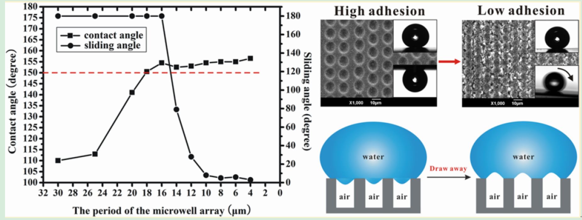 [74]. Yong, Jiale; Chen, Feng;* Yang, Qing; Zhang, Dongshi; Bian, Hao; Du, Guangqing; Si, Jinhai; Meng, Xiangwei; Hou, Xun Controllable Adhesive Superhydrophobic Surfaces Based on PDMS Microwell Arrays. Langmuir, 2013, 29(10): 3274-3279.