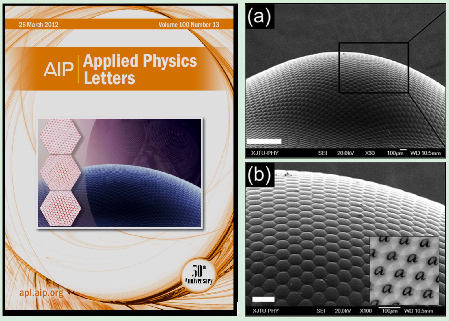 [56]. Liu, Hewei; Chen, Feng;* Yang, Qing; Qu, Pubo; Si, Jinhai; Hou, Xun Fabrication of Bioinspired Omnidirectional and Gapless Microlens Array for Wide Field-of-View Detections. Applied Physics Letters, 2012, 100(13): 133701. (Front Cover)